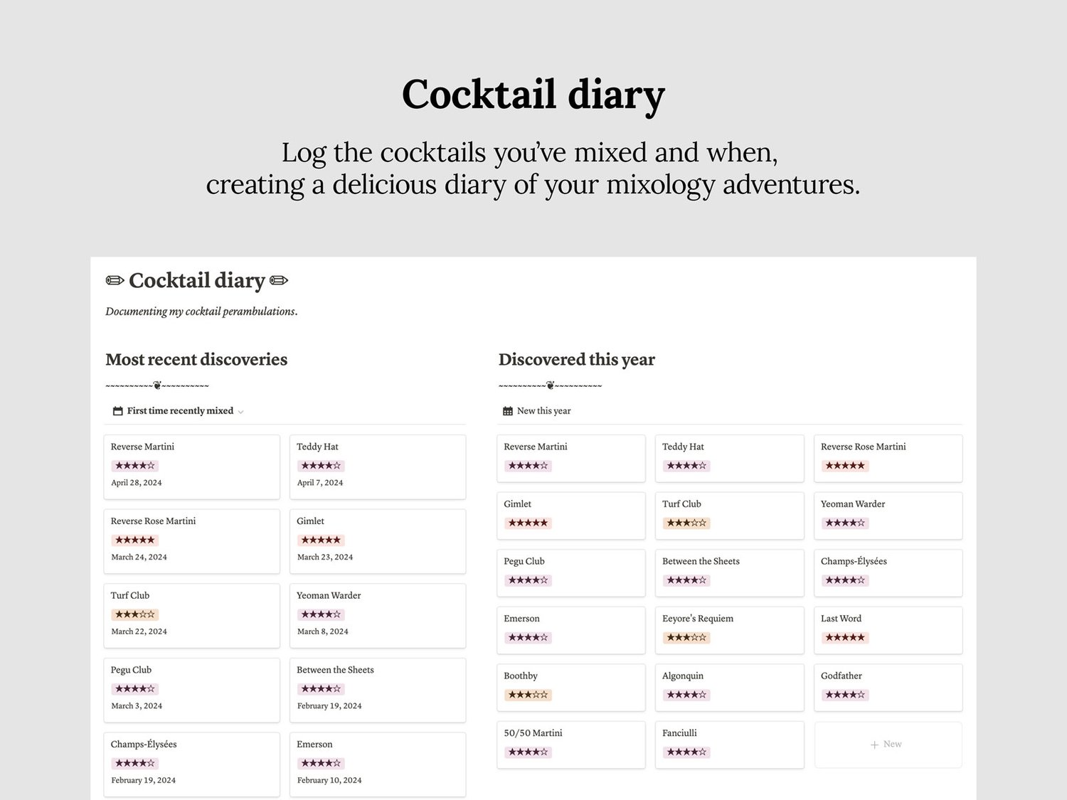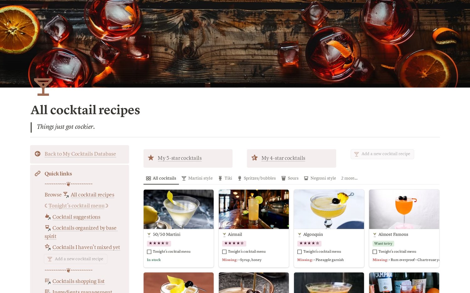 This template requires Notion to use. Once you purchase, you’ll receive a PDF with a link to duplicate the template into your own Notion workspace. From there, you can customize and use it as you see fit. No coding or technical skills required—just a thirst for great cocktails and a dangerous level of enthusiasm.
