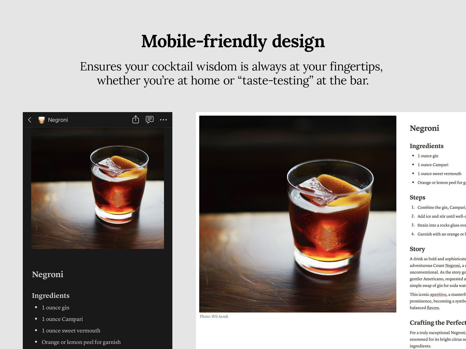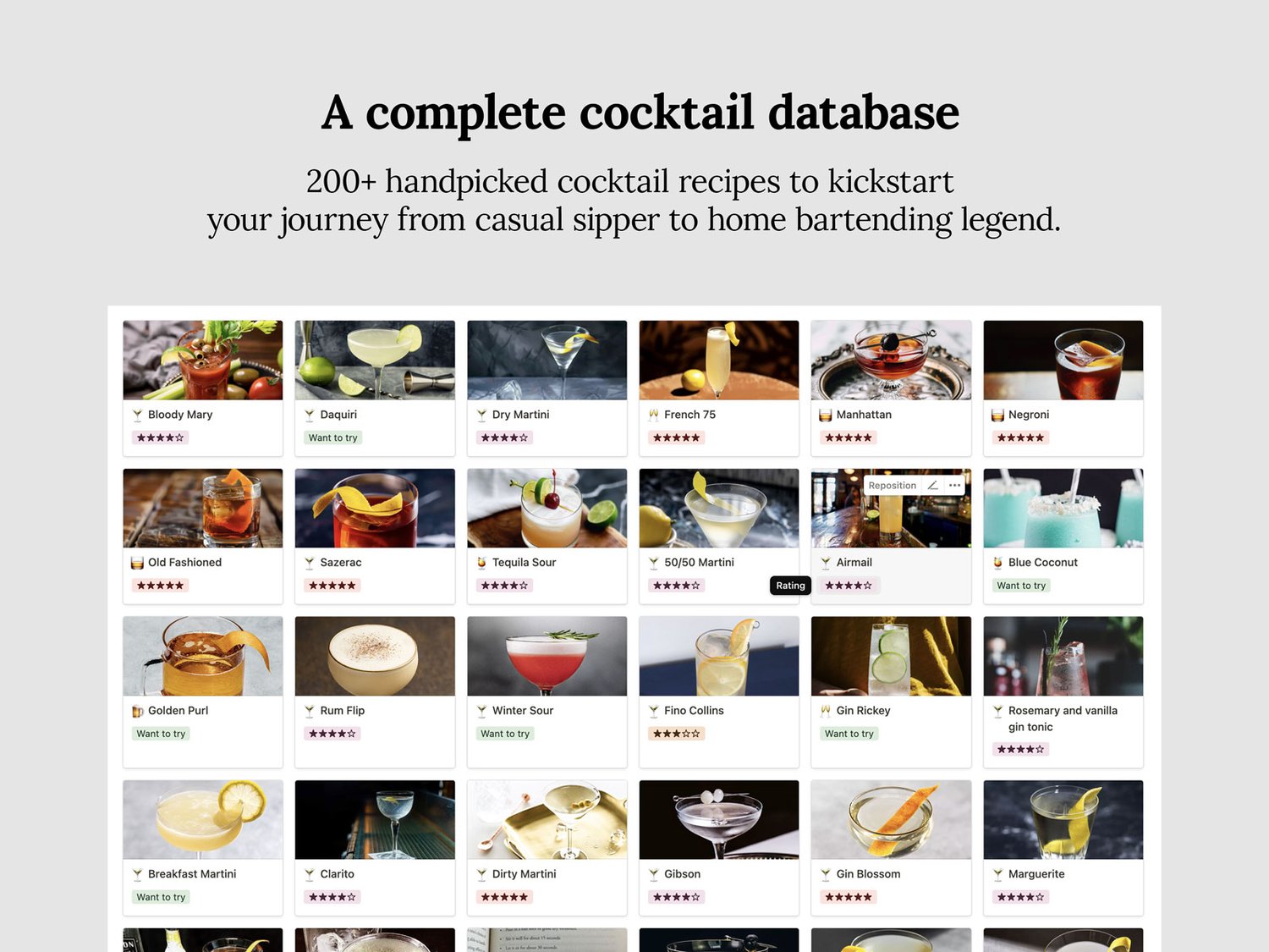 Of course. The template is fully accessible via Notion’s mobile app. So whether you’re at home, at a friend’s place, or raiding a stranger’s liquor cabinet (not recommended), your cocktail wisdom is always at your fingertips.