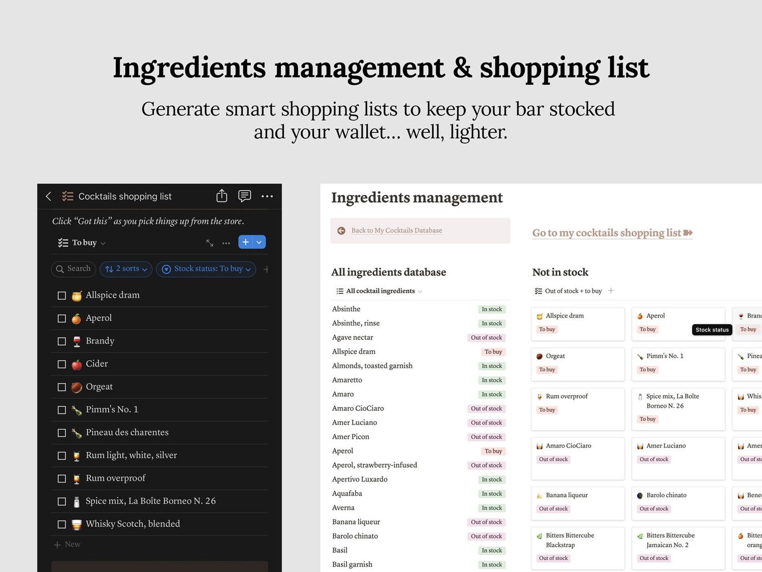 - Cocktails shopping list: Generate smart shopping lists to keep your bar stocked and your wallet… well, lighter.